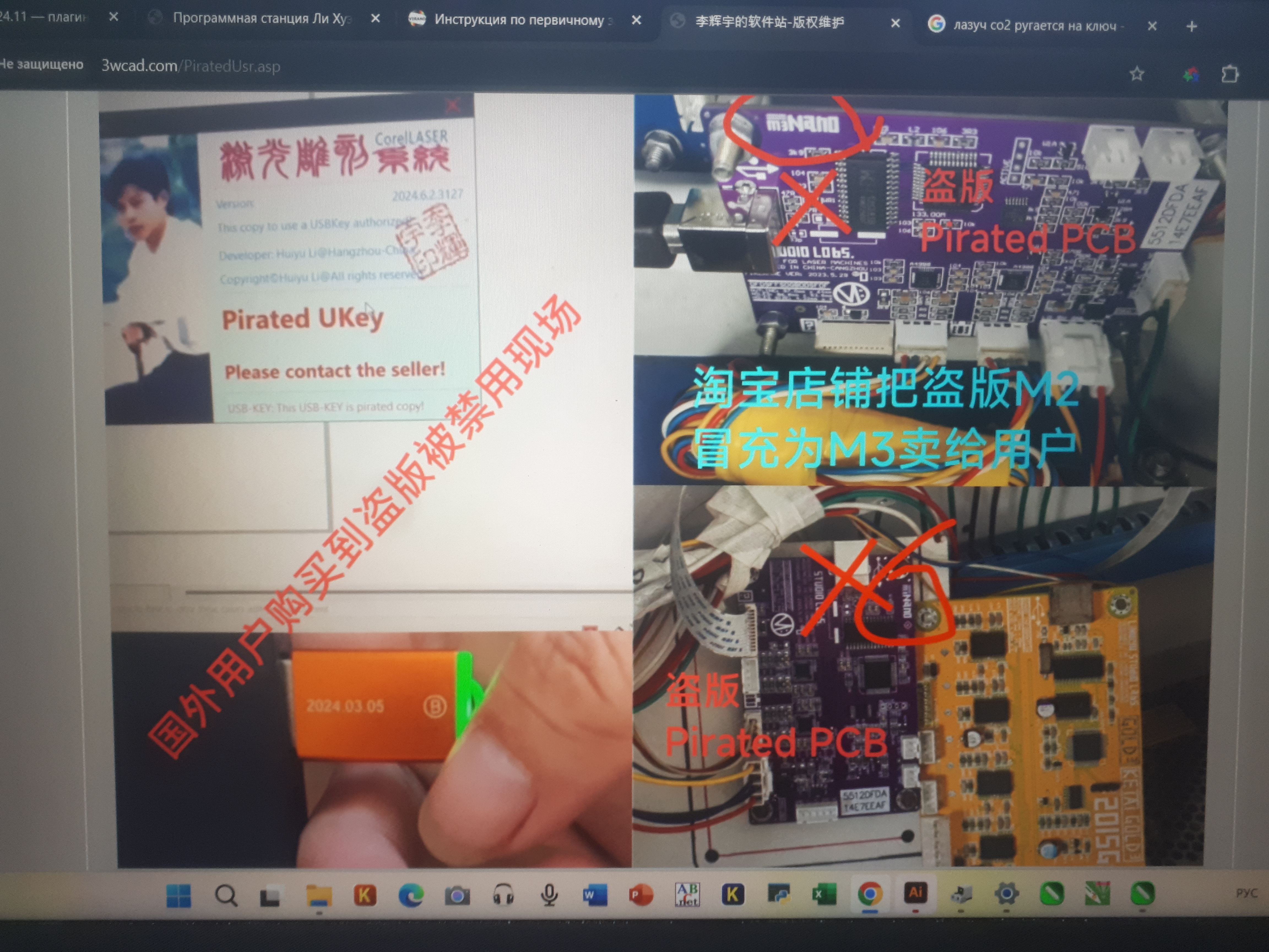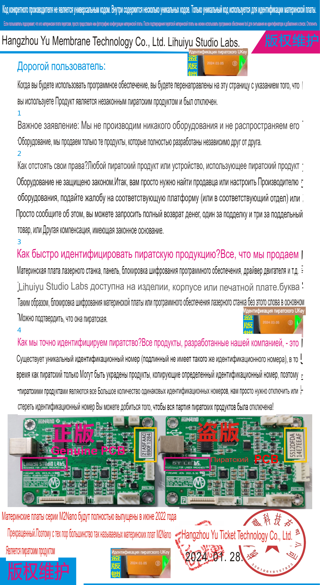 4) в принципе, терять нечего, попробую написать Китайцам по указанному адресу. Уже прям спортивный интерес изучить эту тему до конца. У меня как то хакер делал USB-Guard на другое электронное изделие. Принцип работы понимаю. Но тут еще контроллер М2 Nano. Мне любопытно, в самом контроллере может ли быть прошивка безопасности, которая коррелируется с USB ключом? Потому как оповещение о пиратской копии выскакивает сайтом, но. Если адрес сайта ввести на другом компьютере, то ничего не открывается. Не существует страницы. А со вставленным USB ключом - этот сайт высвечивается. (Выше, скинул скрин этого сайта с переводом).